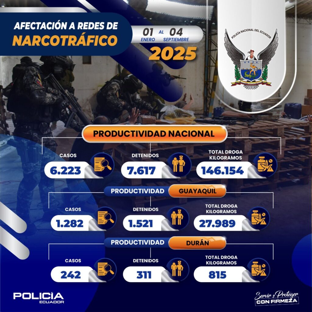 En lo que va del año 2025, a nivel nacional han sido detenidas 7. 617 personas y se ha incautado un total de 146.154,76 kg de droga; en el DMG 28.807,24 kg de sustancias ilícitas y en Durán un total de 815,48 kg. Estas cifras reflejan que las investigaciones desarrolladas por el personal especializado de la Policía Nacional del Ecuador permitieron ejecutar operativos contundentes que afectan directamente a las economías de las estructuras criminales.