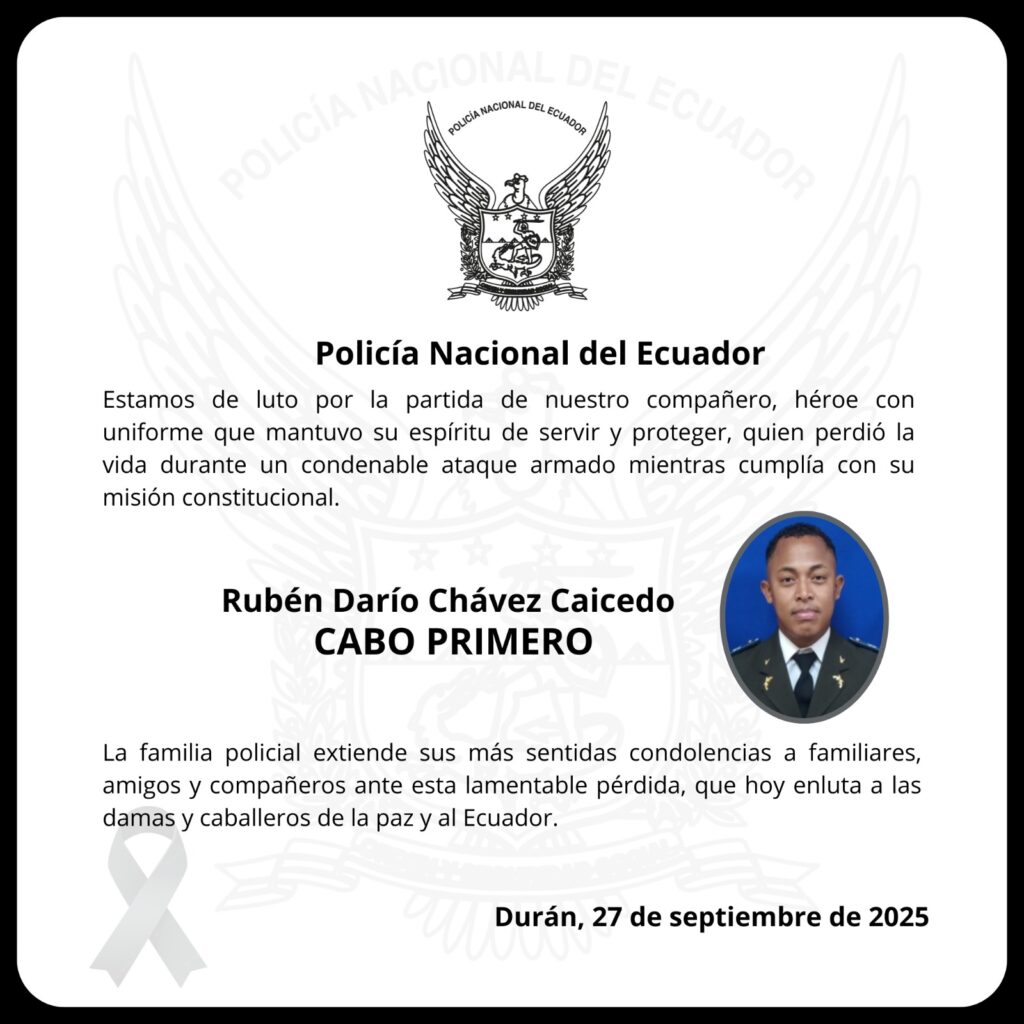La Policía Nacional del Ecuador lamenta informar el fallecimiento del Cabo Primero Rubén Darío Chávez Caicedo, quien perdió la vida en un ataque armado mientras cumplía funciones como parte del equipo de seguridad del concejal de Durán, Hugo Obando.