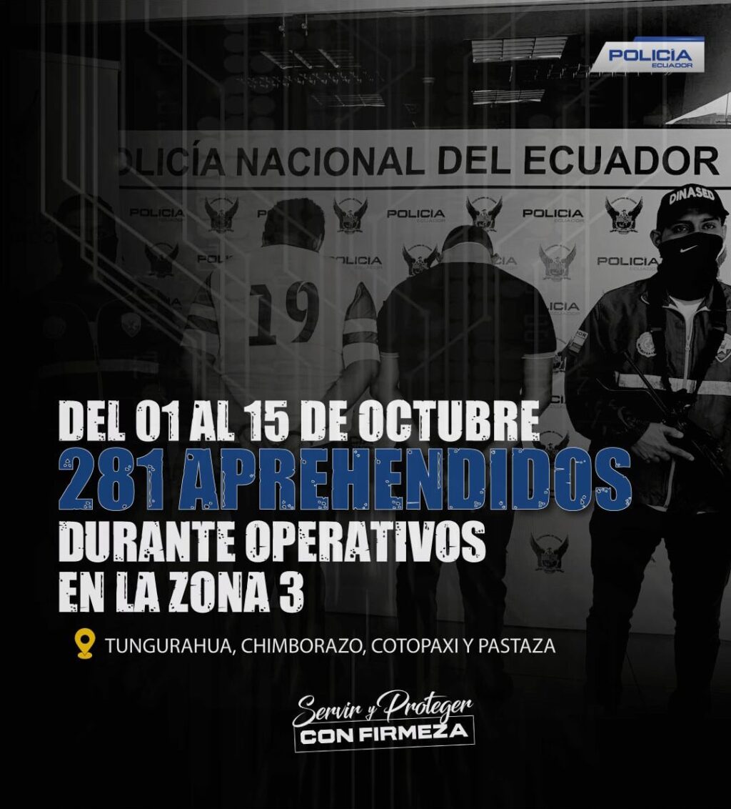 La Policía Nacional del Ecuador, comprometida con la seguridad ciudadana y el bienestar colectivo, mantiene una labor constante en la Zona 3, con la acción efectiva de las Subzonas de Policía Chimborazo, Tungurahua, Cotopaxi y Pastaza, alcanzando importantes resultados operativos durante los primeros 15 días de octubre del año 2025, período en el que 281 ciudadanos fueron detenidos por diversas causas.