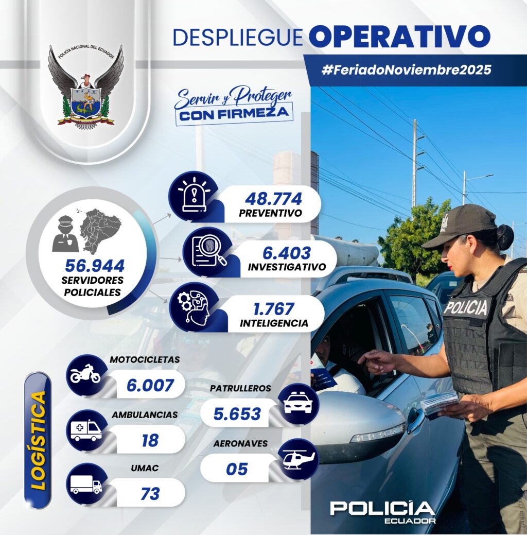 La Policía Nacional del Ecuador desplegará por el feriado la Independencia de Cuenca y Día de los Difuntos, un contingente policial de 56.944 uniformados a nivel nacional. Las acciones operativas iniciarán desde las 12h00 del día viernes 31 de octubre hasta las 06h00 del día miércoles 05 de noviembre de 2025, con el objetivo de garantizar la seguridad ciudadana y el orden público en todo el país.