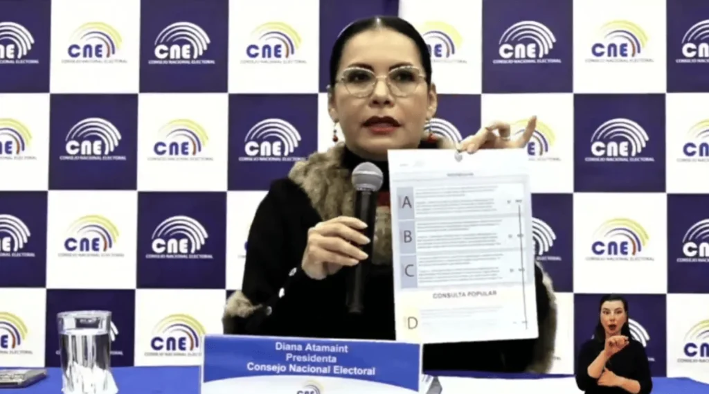 La presidenta del Consejo Nacional Electoral (CNE), Diana Atamaint, desmintió este viernes 31 de octubre que papeletas oficiales de la consulta popular y referéndum 2025 fueran halladas marcadas con la opción ‘No’ en un vehículo en Quito, tras declaraciones del ministro del Interior, John Reimberg, sobre un supuesto decomiso por personal de Aduana.