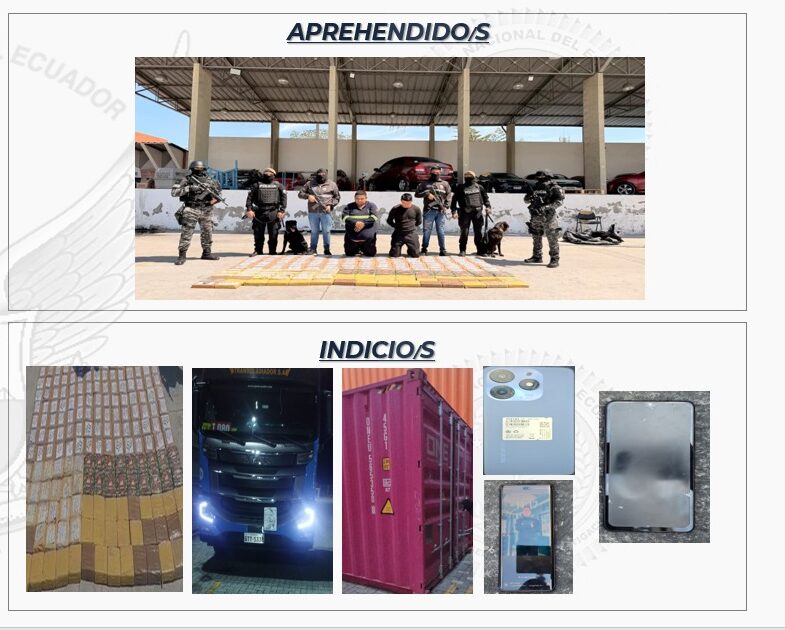 La Policía Nacional del Ecuador, a través de la Unidad Nacional de Investigación de Puertos y Aeropuertos (UIPA), en coordinación con la Unidad Nacional Canina (CRAC) y con el apoyo de Criminalística y GEMA, ejecutó un operativo contra el tráfico internacional de sustancias catalogadas sujetas a fiscalización, la madrugada del 2 de diciembre de 2025, en el Distrito Esteros, Zona 8.