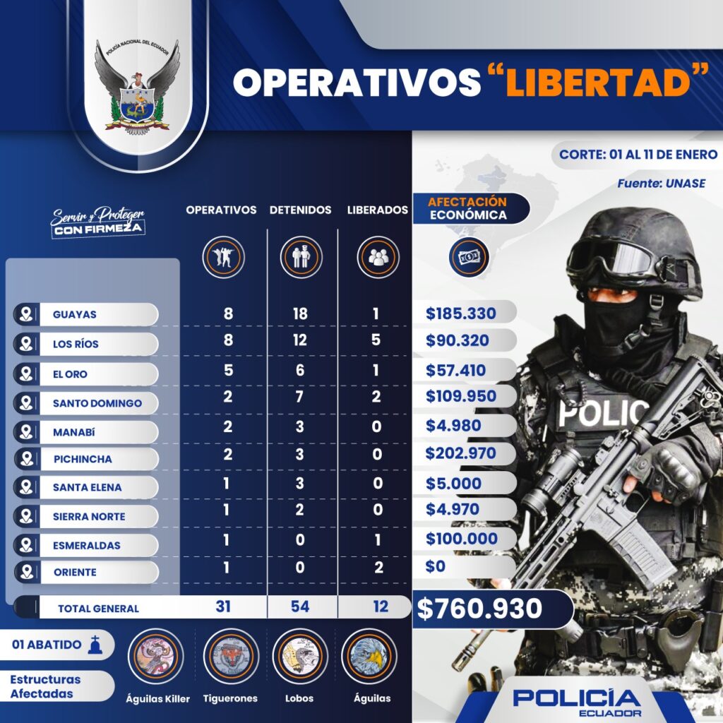 La Policía Nacional del Ecuador, a través de la Unidad Nacional Antisecuestro y Extorsión (UNASE), ejecutó 31 operativos denominados “Libertad”, entre el 1 y el 11 de enero de 2026 en las provincias de Guayas; Los Ríos; El Oro; Santo Domingo; Manabí; Pichincha; Santa Elena; Sierra Norte; Esmeraldas y Oriente. Estas intervenciones afectaron directamente a varias estructuras criminales dedicadas a los delitos de secuestro y extorsión.