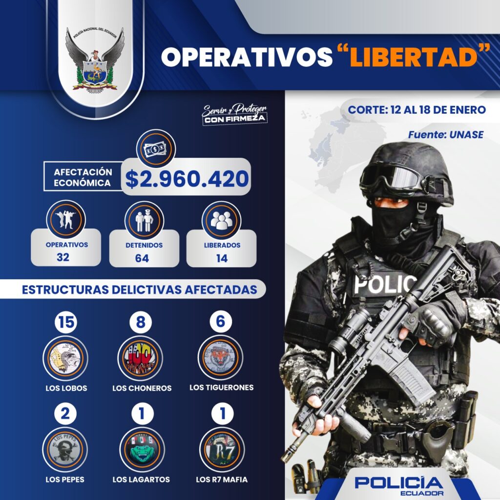 La Policía Nacional del Ecuador, a través de la Unidad Nacional Antisecuestro y Extorsión (UNASE), ejecutó 32 operativos denominados “Libertad”, entre el 12 y el 18 de enero de 2026, en las provincias de Guayas, Manabí, El Oro, Pichincha, Esmeraldas, Los Ríos, Santo Domingo, Santa Elena y Sierra Centro. Estas intervenciones afectaron directamente a varias estructuras criminales dedicadas a los delitos de secuestro y extorsión.