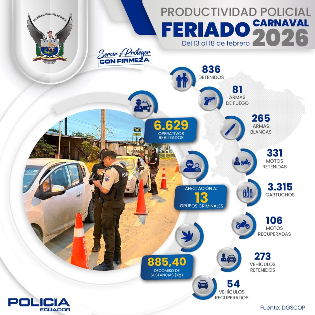 La Policía Nacional del Ecuador ejecutó 6.629 operativos a escala nacional durante el feriado de Carnaval 2026, desarrollados desde las 12h00 del viernes 13 de febrero hasta las 06h00 del miércoles 18 de febrero, con el objetivo de garantizar la seguridad ciudadana, mantener el orden público, asegurar la libre circulación en los ejes viales y precautelar espacios seguros en los principales destinos turísticos del país.