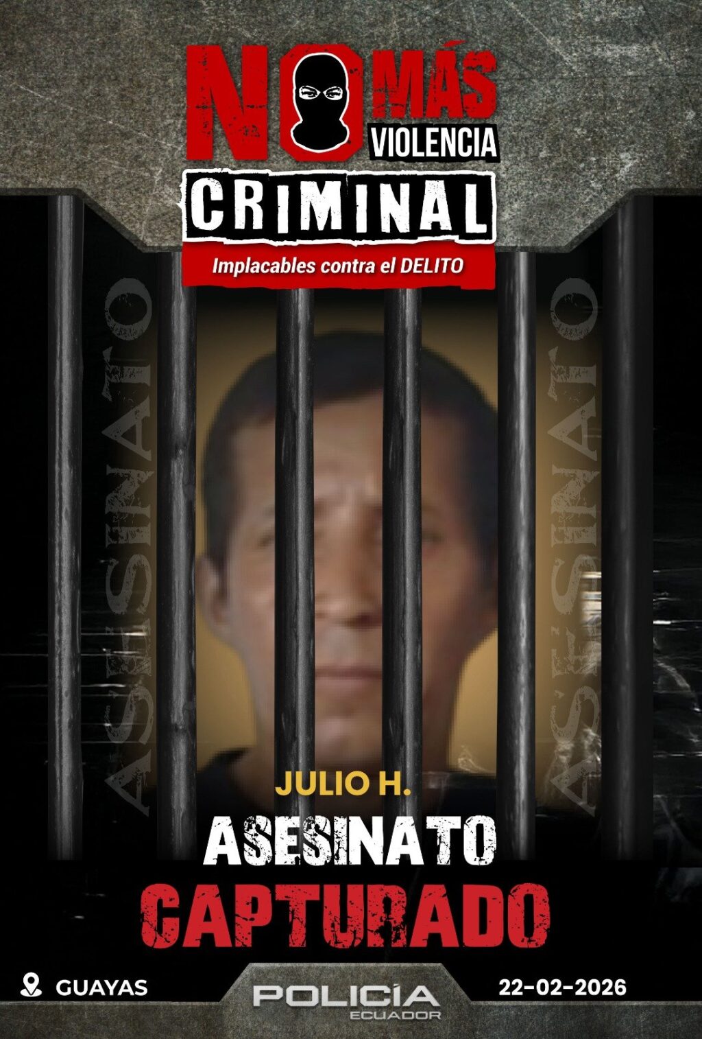 La Policía Nacional del Ecuador, a través del personal del subsistema preventivo, el 22 de febrero de 2026 ejecutó la captura de un ciudadano que mantenía una boleta vigente por su presunta vinculación en un hecho violento ocurrido en el año 2021 en la provincia de Esmeraldas.