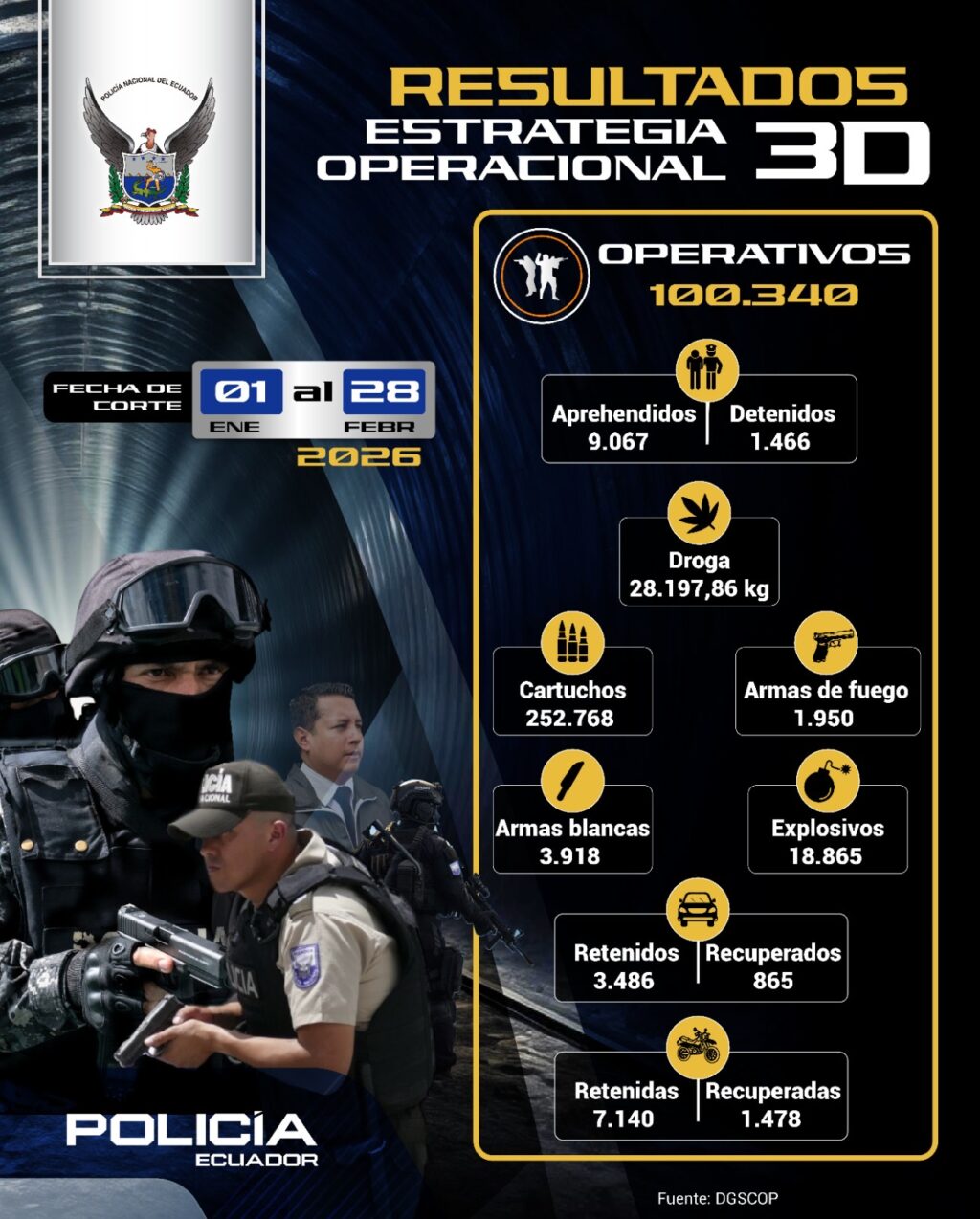 Durante el 01 de enero hasta el 28 de febrero de 2026, la Policía Nacional del Ecuador ha obtenido resultados contundentes en su operatividad, como parte de la Estrategia Operacional 3D (debilitar, desorganizar y desarticular), logrando afectar de manera directa a varias estructuras criminales que operaban en diferentes provincias del país.