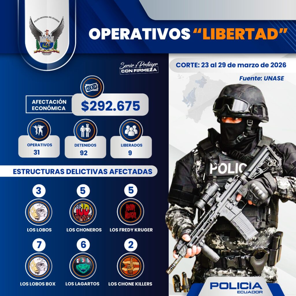 Entre el 23 y el 29 de marzo de 2026, la Policía Nacional del Ecuador, a través de la Unidad Nacional Antisecuestro y Extorsión (UNASE), ejecutó 31 intervenciones simultáneas en varias provincias del país, como parte de los operativos denominados “Libertad”.