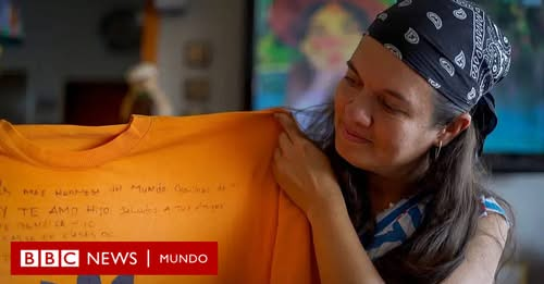 De vuelta en casa de su familia, Adriana Briceño sostiene una camiseta vieja con algunas frases garabateadas con bolígrafo.