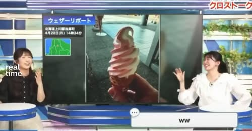En él se puede ver un fragmento de Weathernews LiVE, un canal meteorológico que transmite 24/7 principalmente a través de internet. Durante la emisión del programa Crosstalk (クロストーク) las presentadoras Sina Ogawa y Riina Kobayashi, que se estaban dando el relevo entre un programa y otro, bromeaban sobre un estudio que afirmaba que tomar helado ayuda con la resaca.