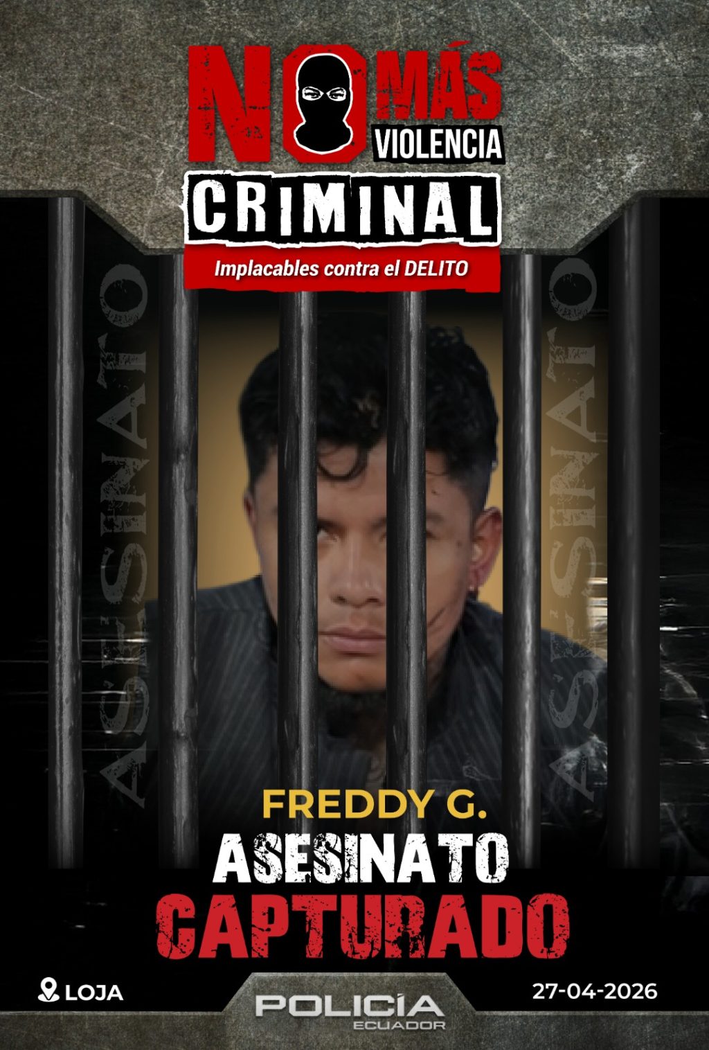 El 27 de abril de 2026, en el sector El Calvario, en la ciudad de Loja, la Policía Nacional del Ecuador verificó el fallecimiento de un ciudadano y aprehendió a un presunto implicado en el delito de asesinato, tras un hecho violento registrado en un inmueble de la zona.